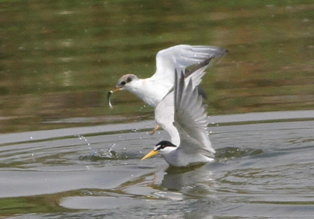 All of a sudden the tern has caught a fish and a youngster has flown down to beg