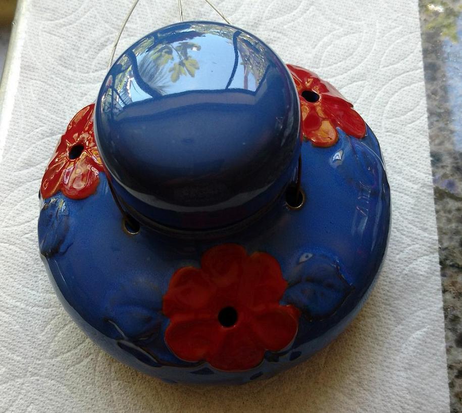 seen before and it appeared to be brand new! It is made out of ceramic and has three pretty flowers on the outside where there are holes for the hummingbirds to get