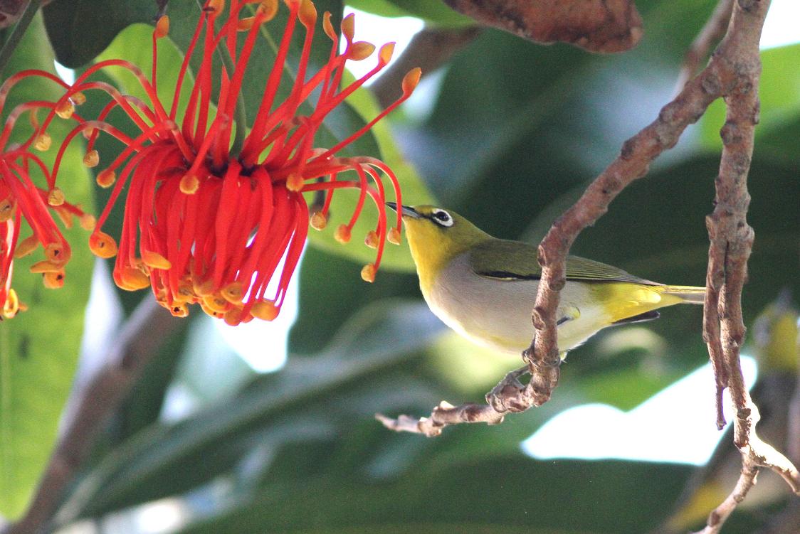 I also noticed that the white-eye would chase away the hummingbirds that wanted to get some nectar. I got a few shots of the hummingbird coming to the flower when they were not around.