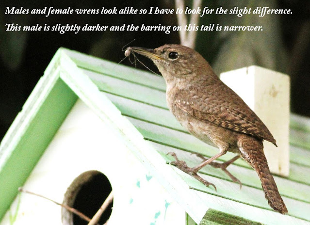 took photos of one of the wrens bringing in fluff for Mr. Cricket's birdhouse.